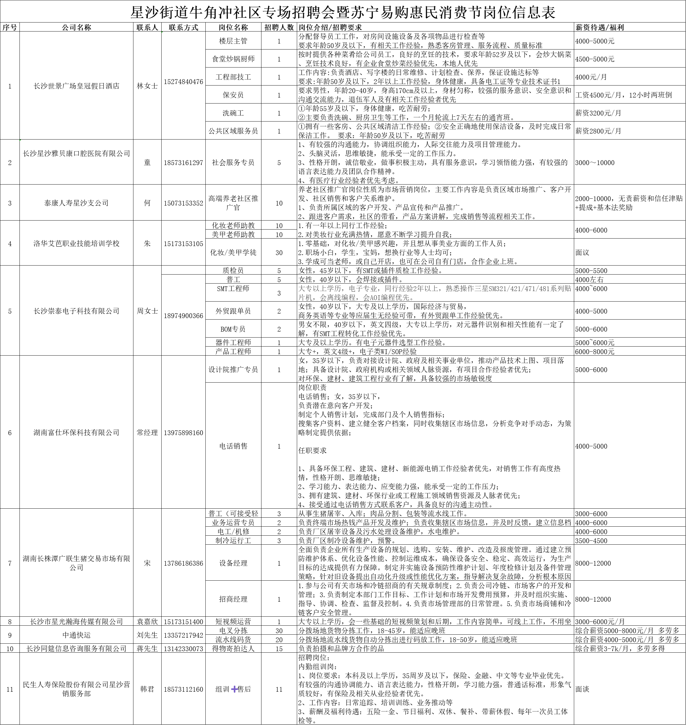 星沙时报4月16日讯(记者 彭永礼)就在明天,本周五(4月17日)下午14:00-17:00,星沙街道牛角冲社区专场招聘会暨苏宁易购惠民消费节将在星沙开元路与板仓路交会处苏宁易购卖场大厅及前坪举办。本次招聘会汇总用工单位37家,岗位897个,面向社会人群。广大求职者可通过下方表格获取相应岗位信息。